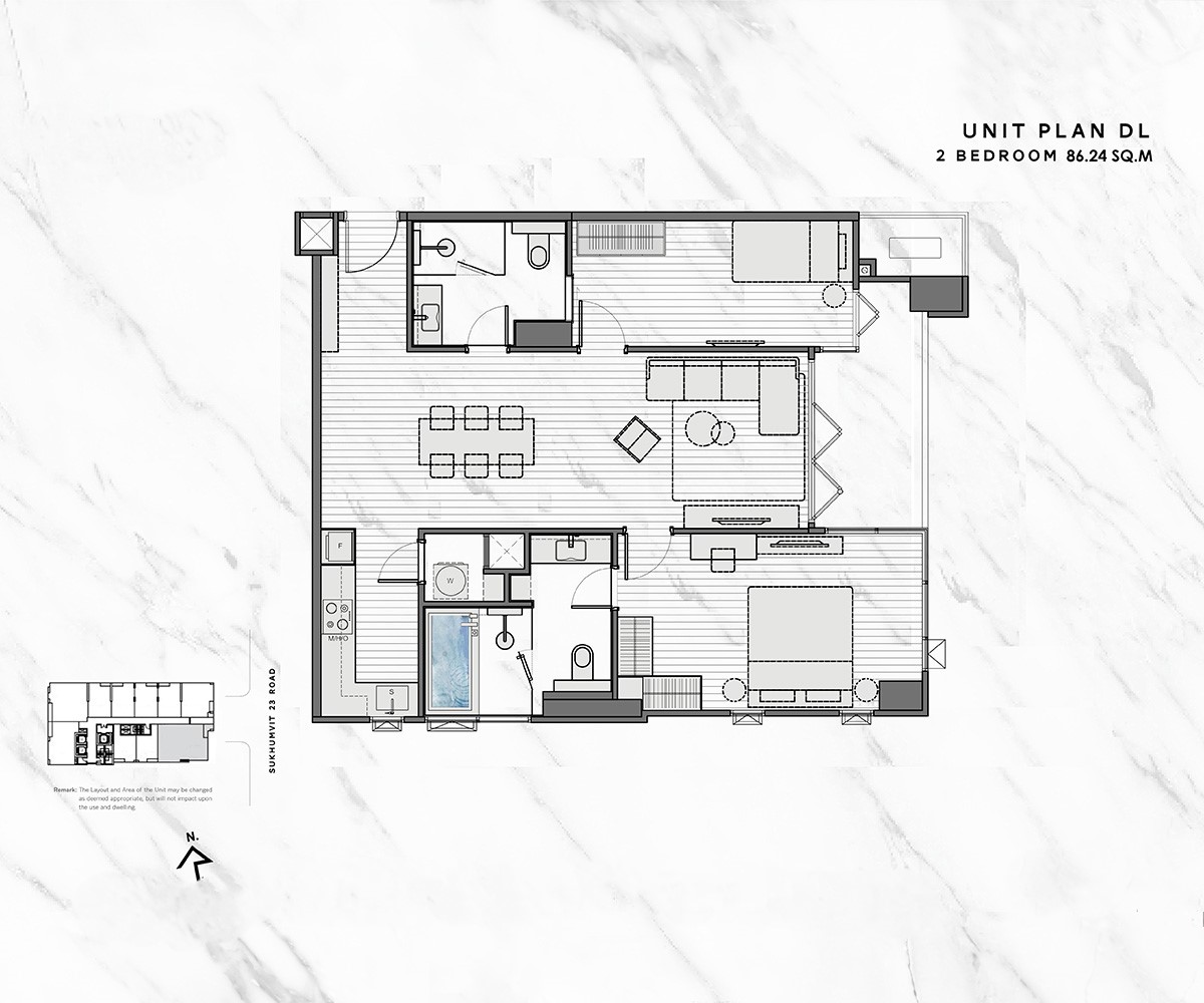 Experience the pinnacle of urban living in this breathtaking designer 2-bedroom, 2-bathroom condo unit on the 12th floor, located within a newly completed luxury development. Just steps away from the Asoke junction, where the BTS Skytrain and MRT Subway connect, this immaculate 86 sq.m layout is fully furnished and waiting for you to call it home.